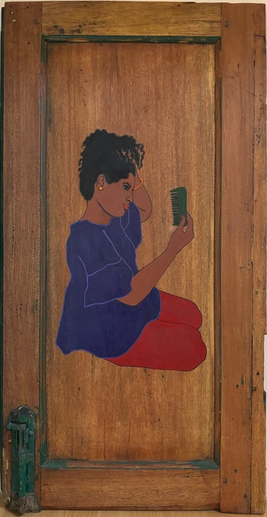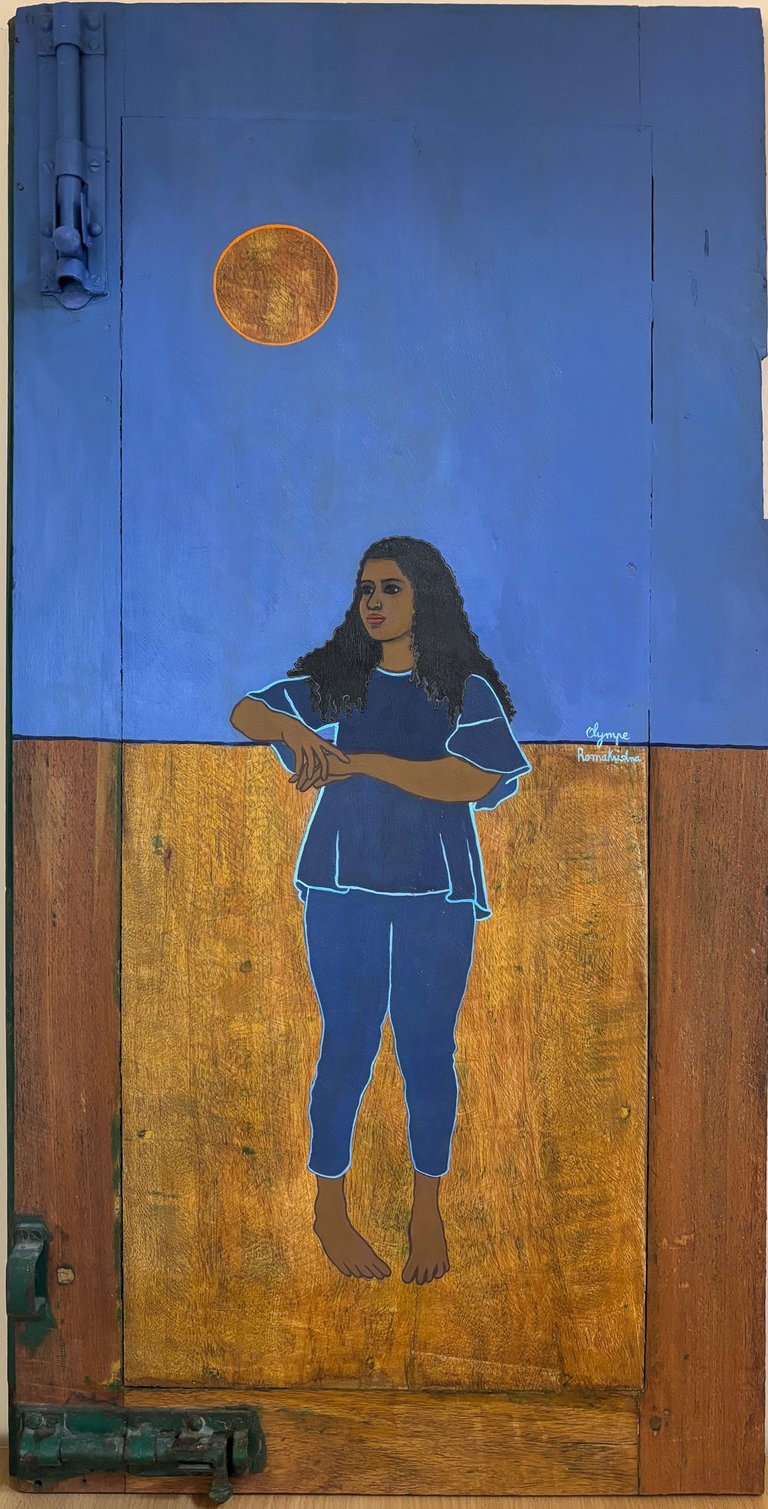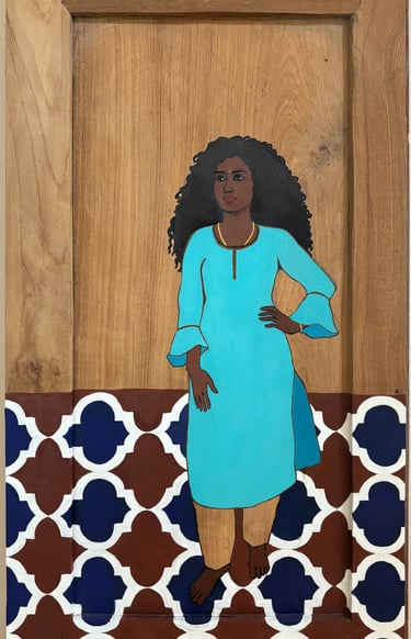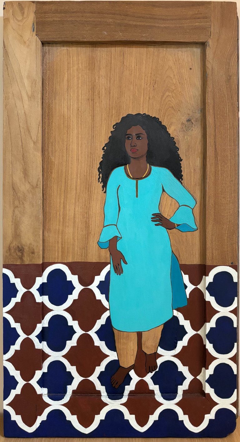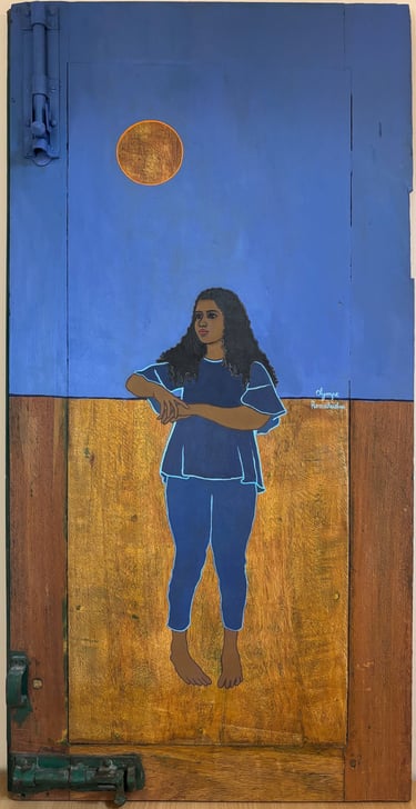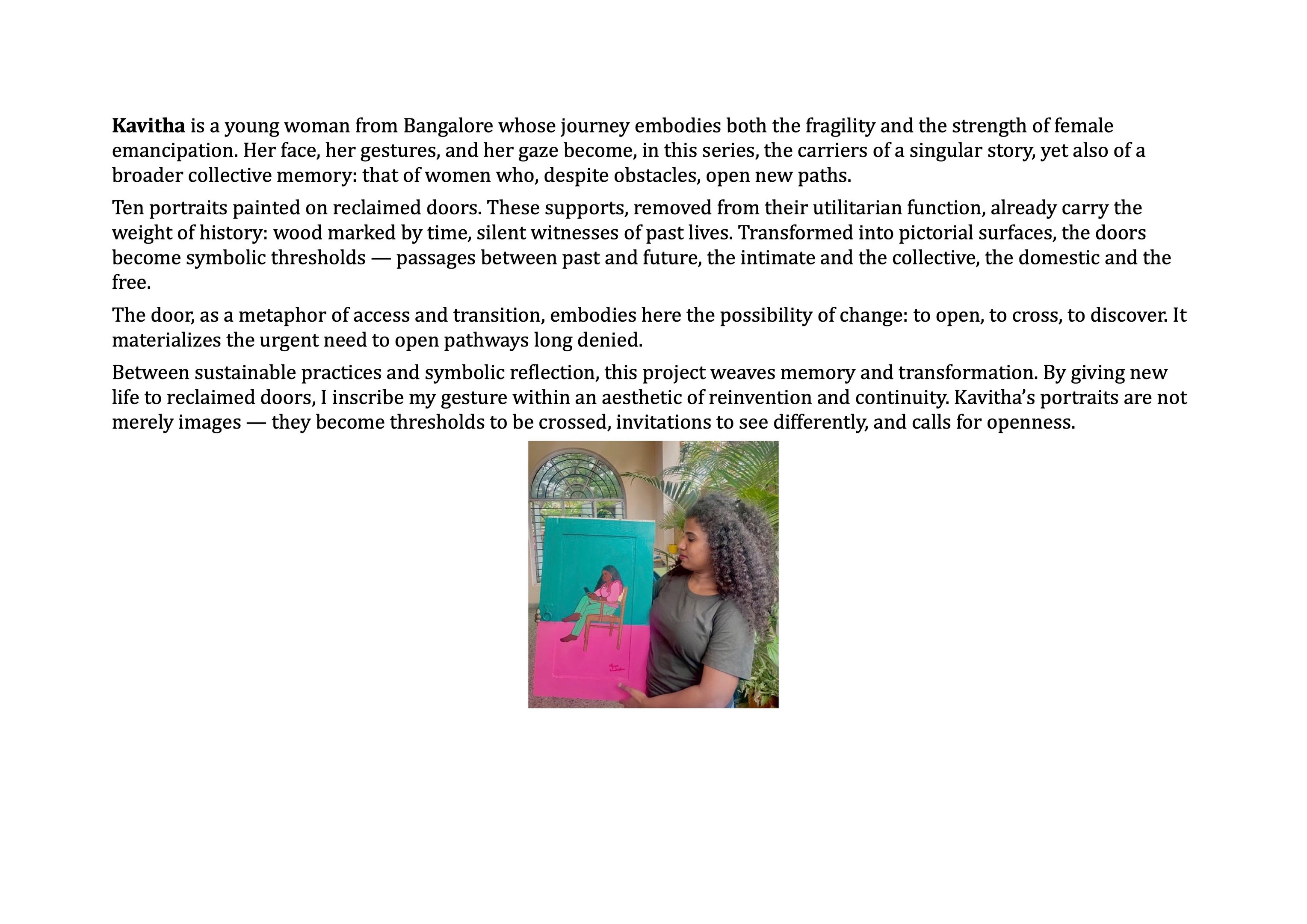 “Ten portraits of Kavitha on reclaimed doors: openings onto a feminine identity shaped by strength and resilience.”