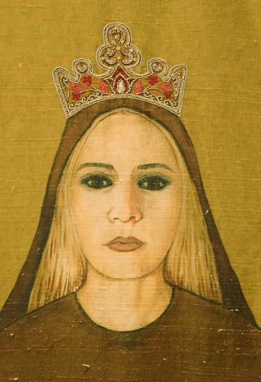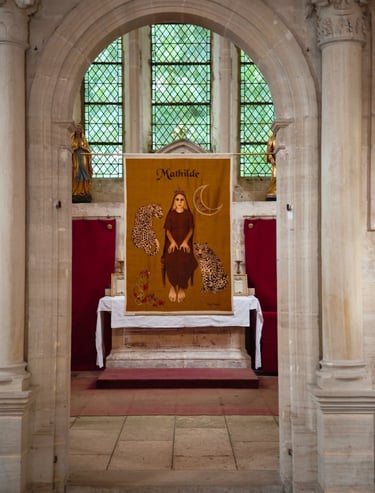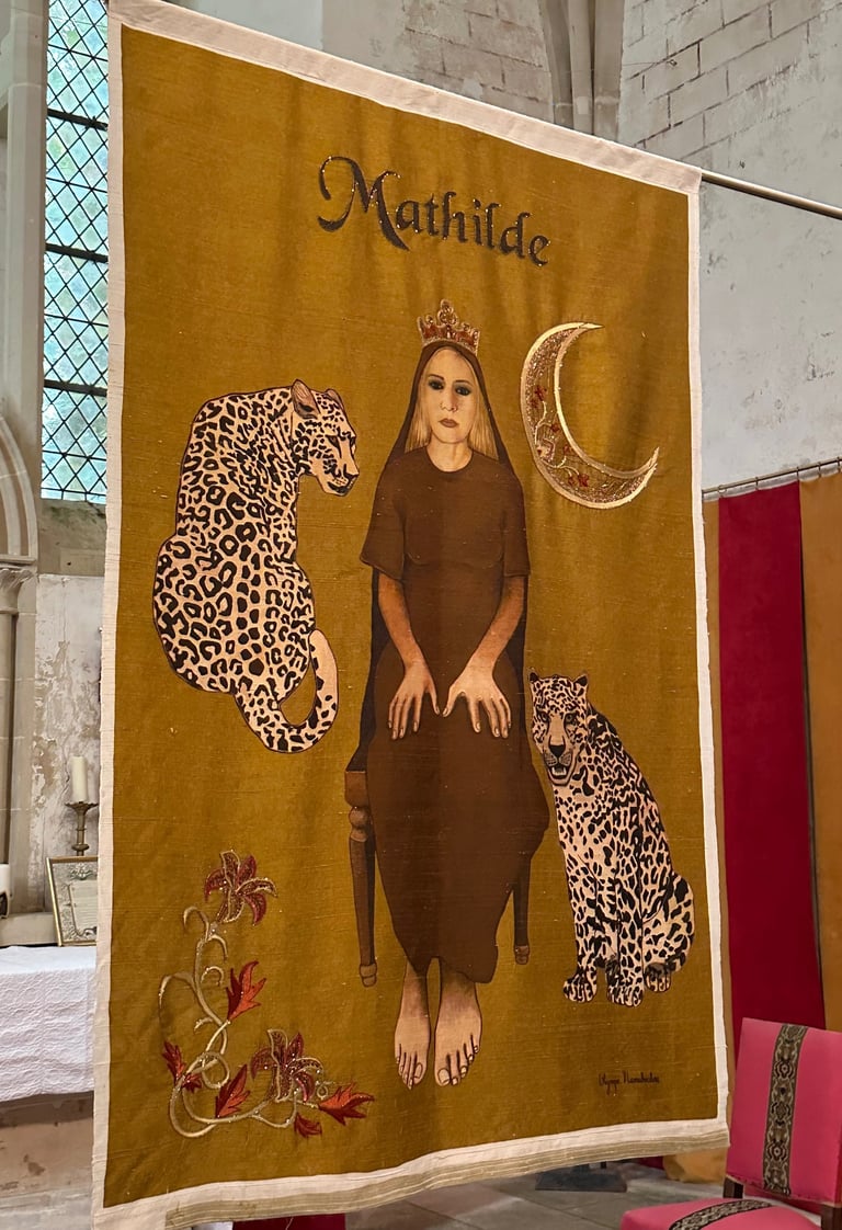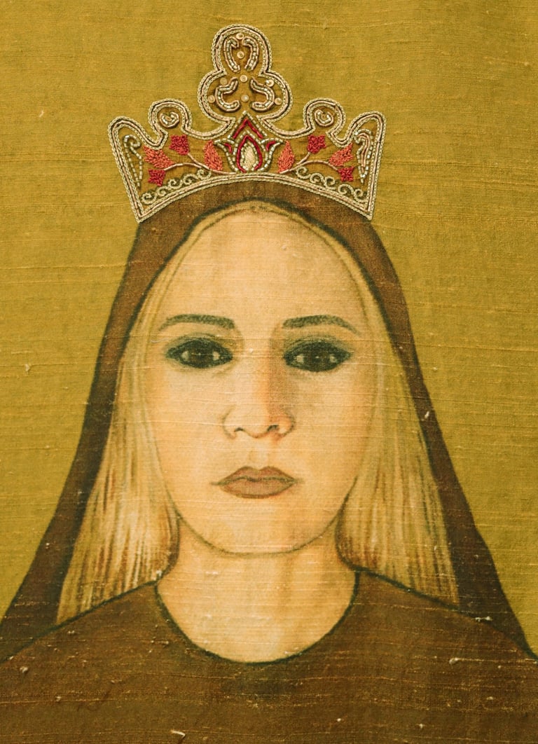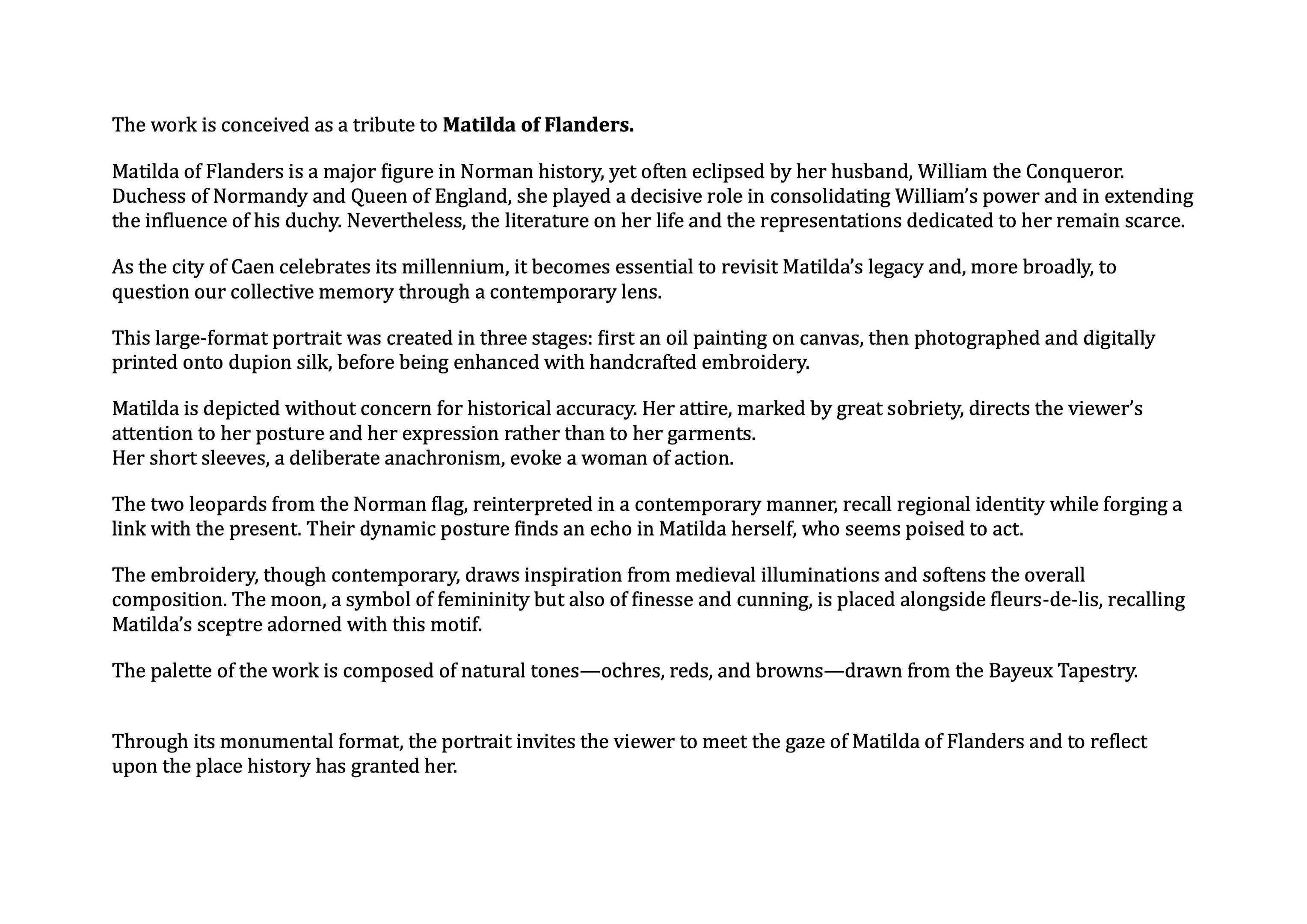 “Between painting, dupion silk, and handcrafted embroidery, a contemporary portrait draws on Norman imagery and made to reinvent the memory of Matilda of Flanders.”