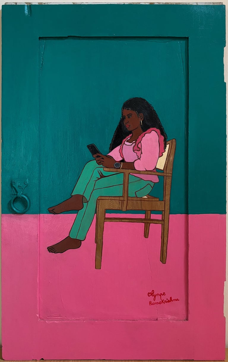 “Ten portraits of Kavitha on reclaimed doors: openings onto a feminine identity shaped by strength and resilience.”