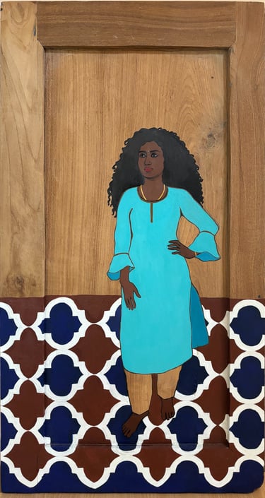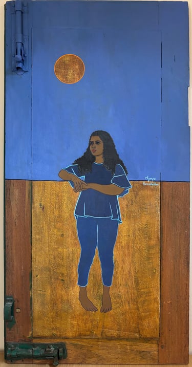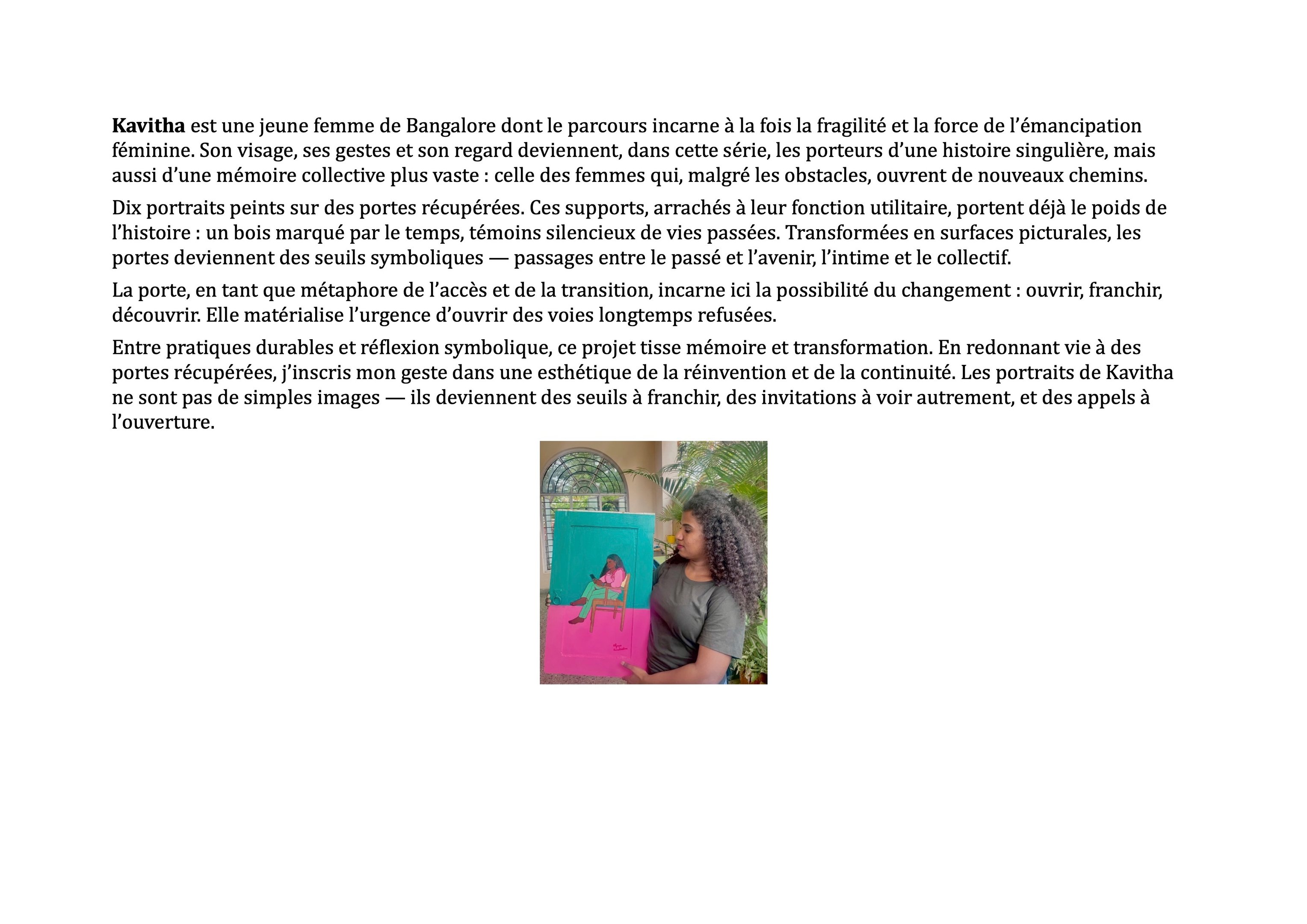 « Dix portraits de Kavitha sur des portes récupérées : des ouvertures sur une identité féminine façonnée par la force et la résilience. »