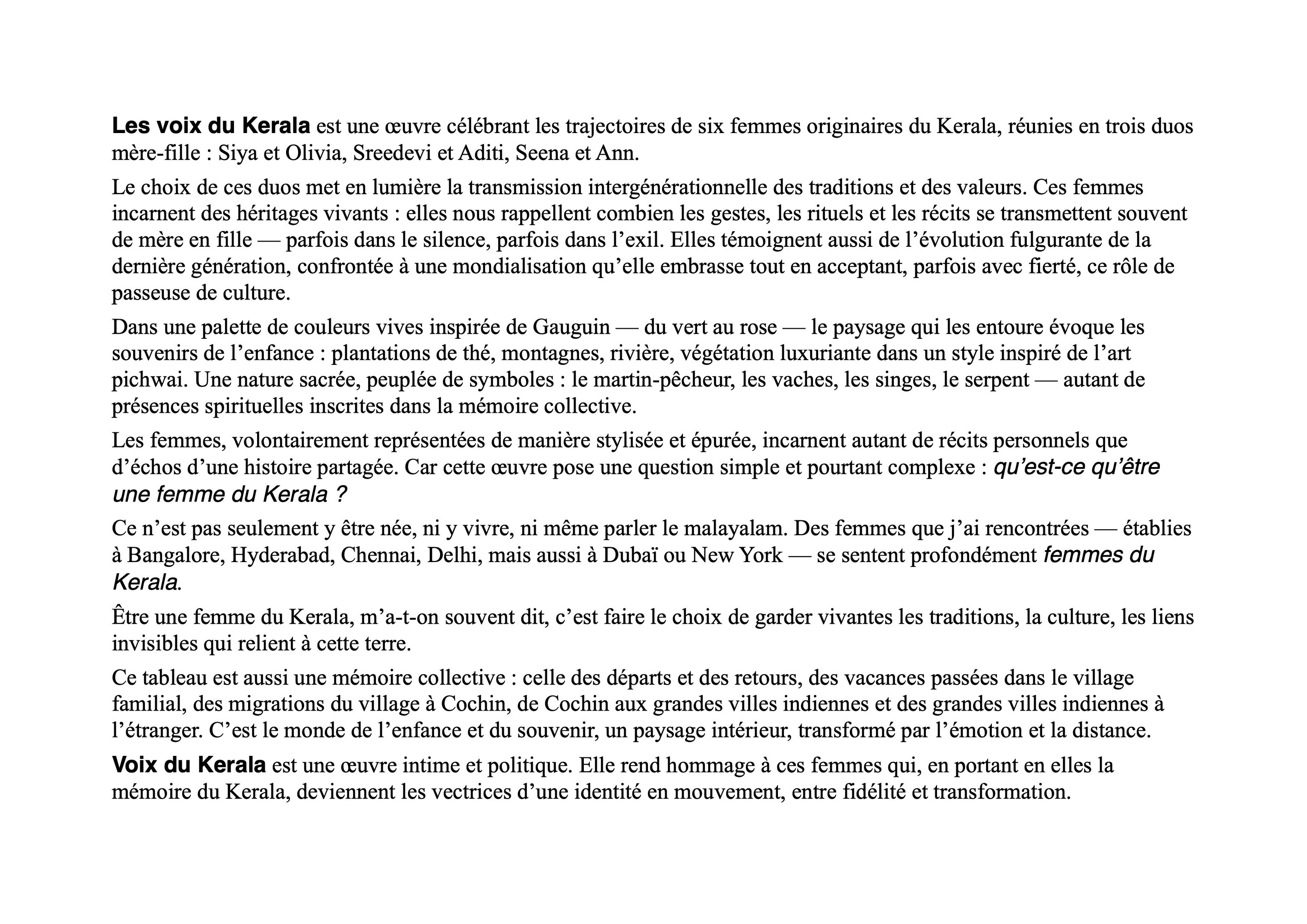 « Au milieu des plantations de thé, des rivières et d’une nature sacrée, les paysages du Kerala se transforment en paysages intérieurs, tissés de mémoire et d’émotion. »